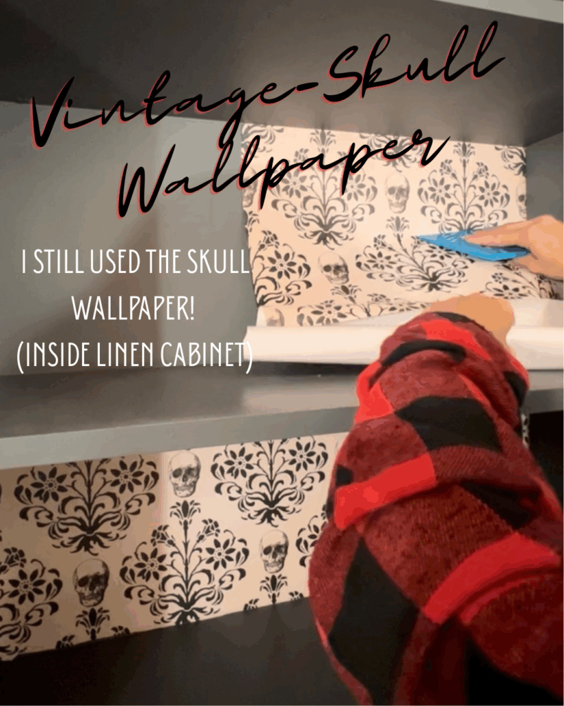 Check out the picture below, where I added the skull wallpaper in the backs of the linen cabinet!
